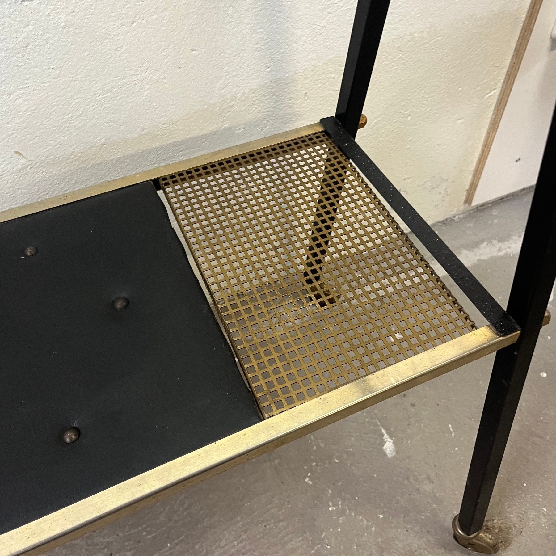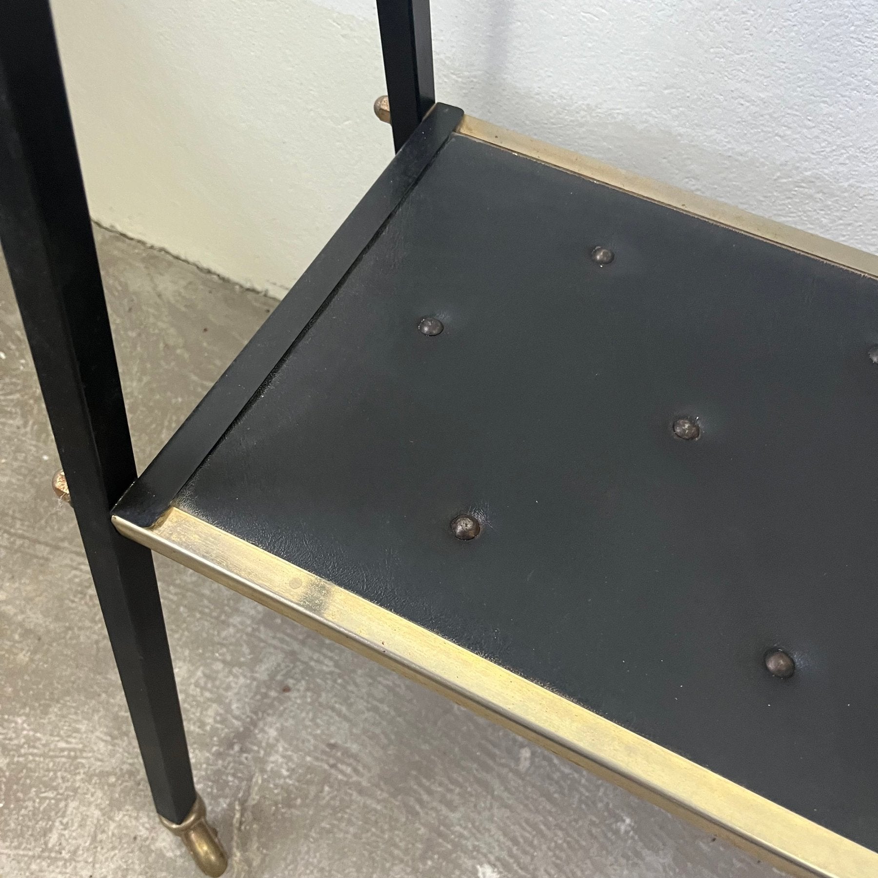 The upper tier features a beautifully textured glass surface framed by a gold-toned metal surround, lending a subtle touch of luxury. Below, the second tier is finished in black stitched faux leather with perforated metal detailing, supported by a black metal frame. Completing the design is an integrated bottle holder, a distinctly period feature that reinforces its cocktail-hour credentials.