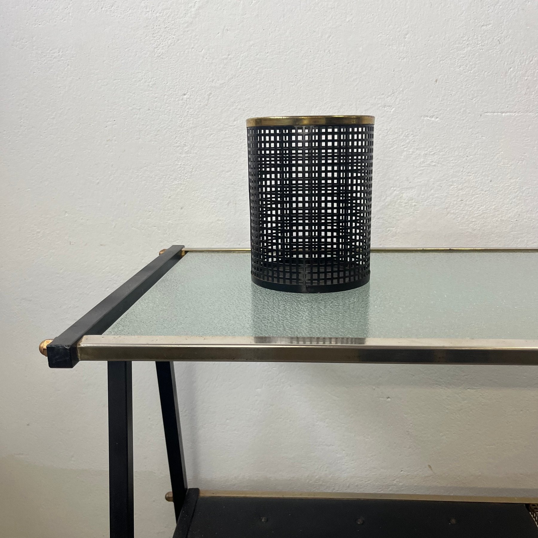 The trolley remains in good vintage condition, showing light signs of use consistent with age, while retaining its crisp mid-century character. Due to the size and fragility of the glass, collection is recommended.