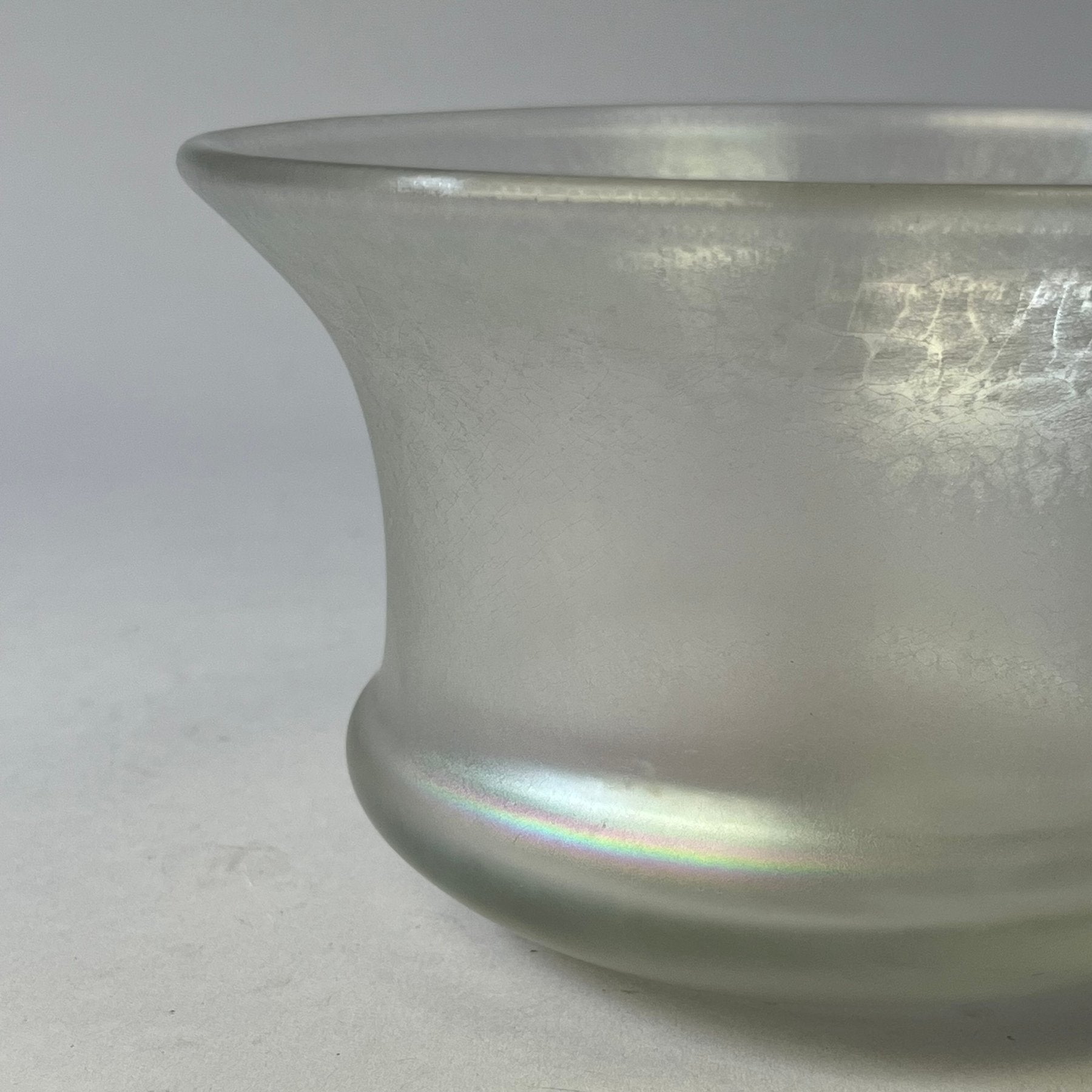A beautifully expressive piece of studio glass by the celebrated German glass artist Erwin Eisch, dating from the late 1960s. This iridescent vase shimmers with shifting tones and depth, capturing light in a way that is both playful and quietly sophisticated — a hallmark of Eisch’s pioneering approach to modern studio glass.
